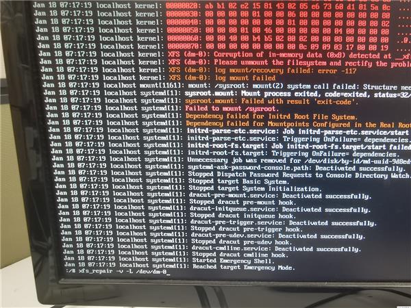 xfs_repair -v -L /dev/mapper/centos-root 等同 xfs_repair -v -L /dev/dm-0 解释:-L 选项指定强制日志清零,强制xfs_repair将日志归零,即使它包含脏数据(元数据更改)。