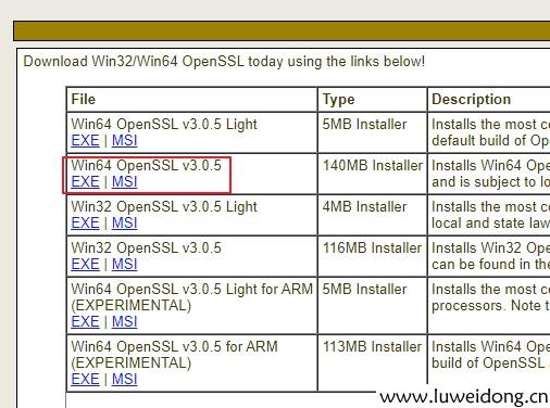 根据自己的系统类型点击下载,我下载的是Win64 OpenSSL v3.0.5
