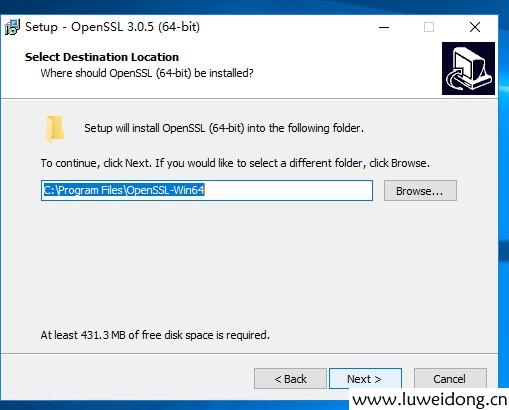 如图所示,安装过程中会显示安装目录为:C:\Program Files\OpenSSL-Win64