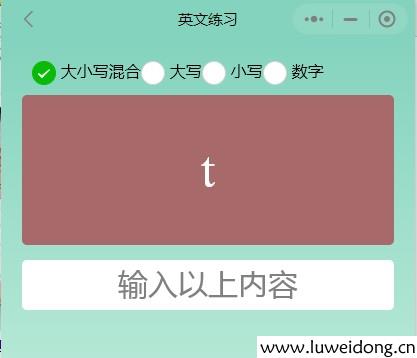 打开英文练习,可供选择的有大小写混合、大写、小写或者数字。当输入正确时,自动切换显示下一个,输入错误时,背景色由白色变为深色。