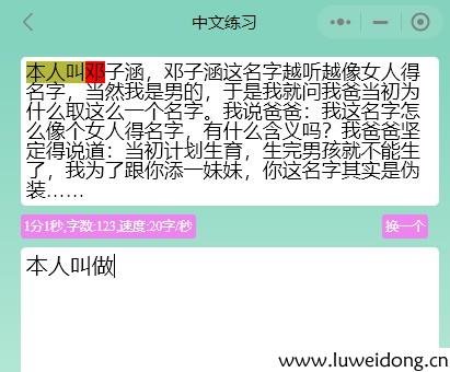 打开中文练习,显示的是一段随机的文字,文字后面是输入花费的时间,当前文字总数,输入速度。