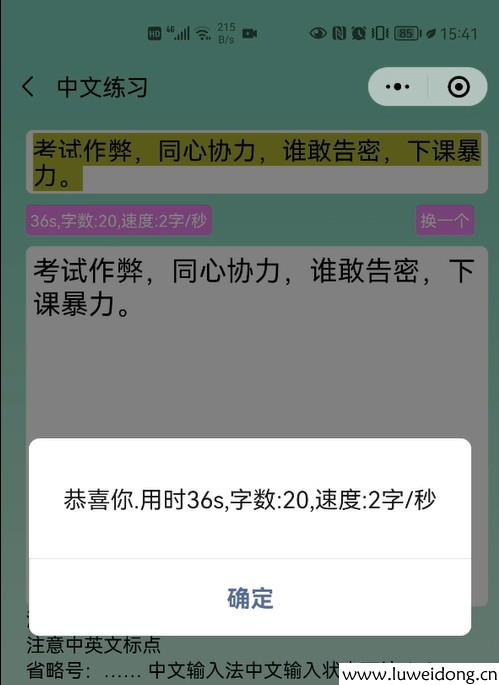 当把所有字段输入完毕后,弹出用时,字数总数,输入速度等统计信息。