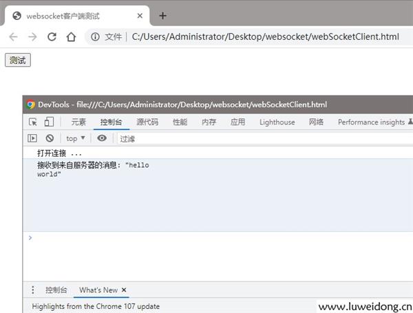 双击在浏览器中打开webSocketClient.html,同时按F12打开调试器。点击“测试”按钮,观察控制台面板,可看到websocket接收到来自服务器的消息“hello world”