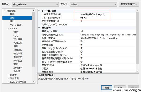 公共语言运行时支持,选择:公共语言运行时支持(/clr),.net目标框架版本:v4.7.2