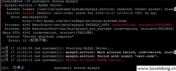 此时重启mysqld服务提示权限不够,按以上问题2的方法解决。