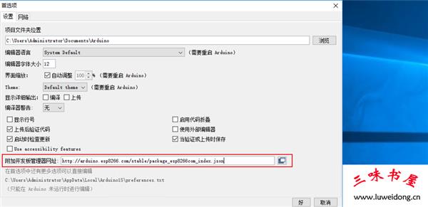 2、填写ESP8266开发板管理器网址: