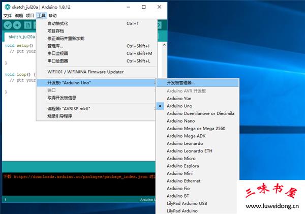 3、打开工具->开发板->开发板管理器