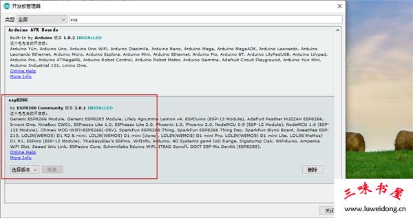 4、在搜索框输入esp,点击安装esp8266,如图已是安装完毕