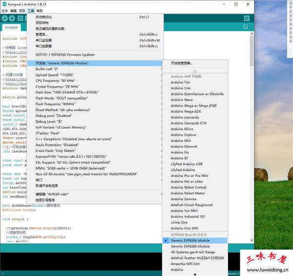 查看:打开工具->开发板,是否出现Generic ESP8266 Module,如有安装成功。