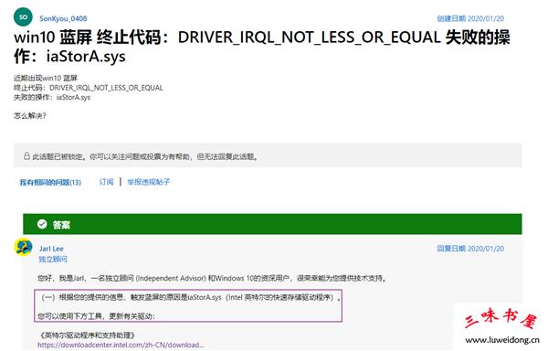 如图:提示终止代码:DRIVER_IRQL NOT_LESS_OR_EQUAL,失败的操作:iaStora.sys