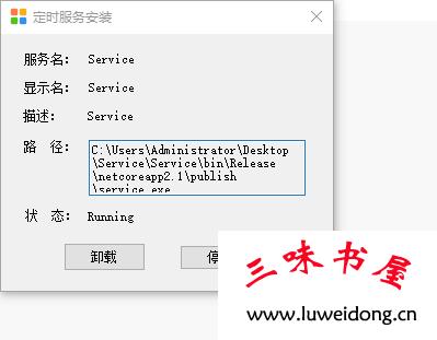 8、安装服务并执行,ps此处使用的是本人编写的服务安装小软件,用法请移步:服务程序安装小助手