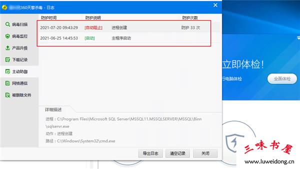 一段操作之后,才想起来最近对服务器的唯一更新就是按照集团的要求安装了360天擎杀毒软件,赶紧打开日志,果然如此: