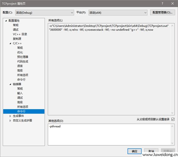VS中,在下述位置添加-pthread选项: