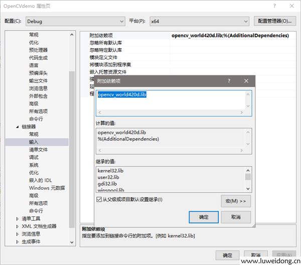 注意:debug模式下填写opencv_world420d.lib,release模式下填写opencv_world420.lib