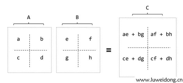 如上图所示,C=AB。C中第i行第j列所在元素C(i,j)等于A中第i行所有元素跟B中第j列所有元素一一对应的乘积之和。